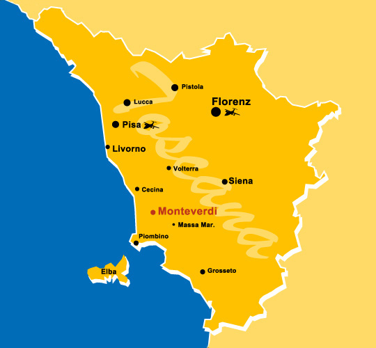 In dem Gebiet der nördlichen Maremma, gegenüber der Insel Elba, zwischen Follonica und Cecina befinden sich die malerischen Orte Suvereto, Campiglia Marittima, San Vincenzo und Castagneto Carducci, Bolgheri und Massa Marittima.